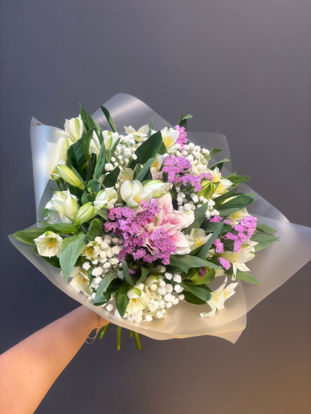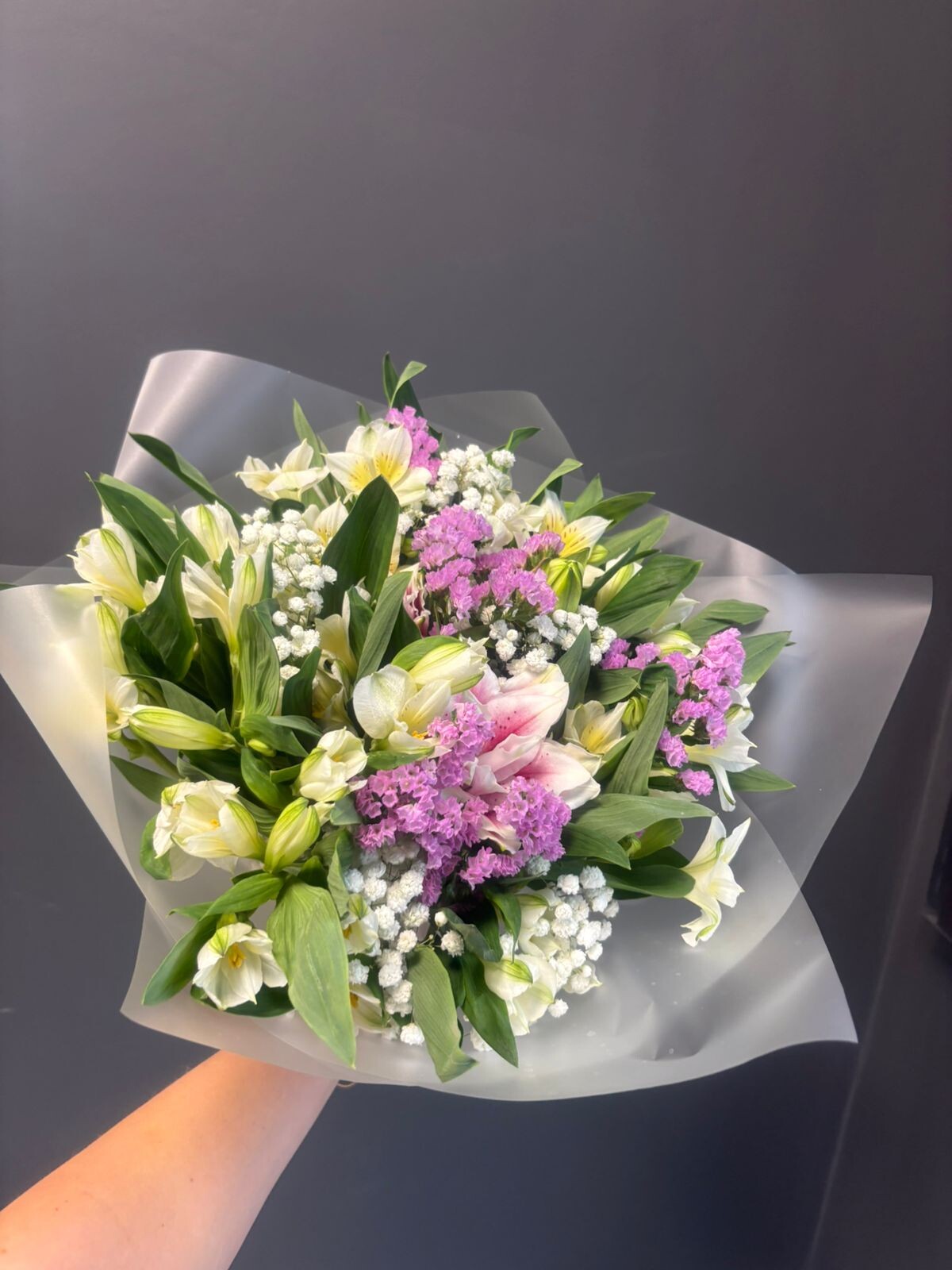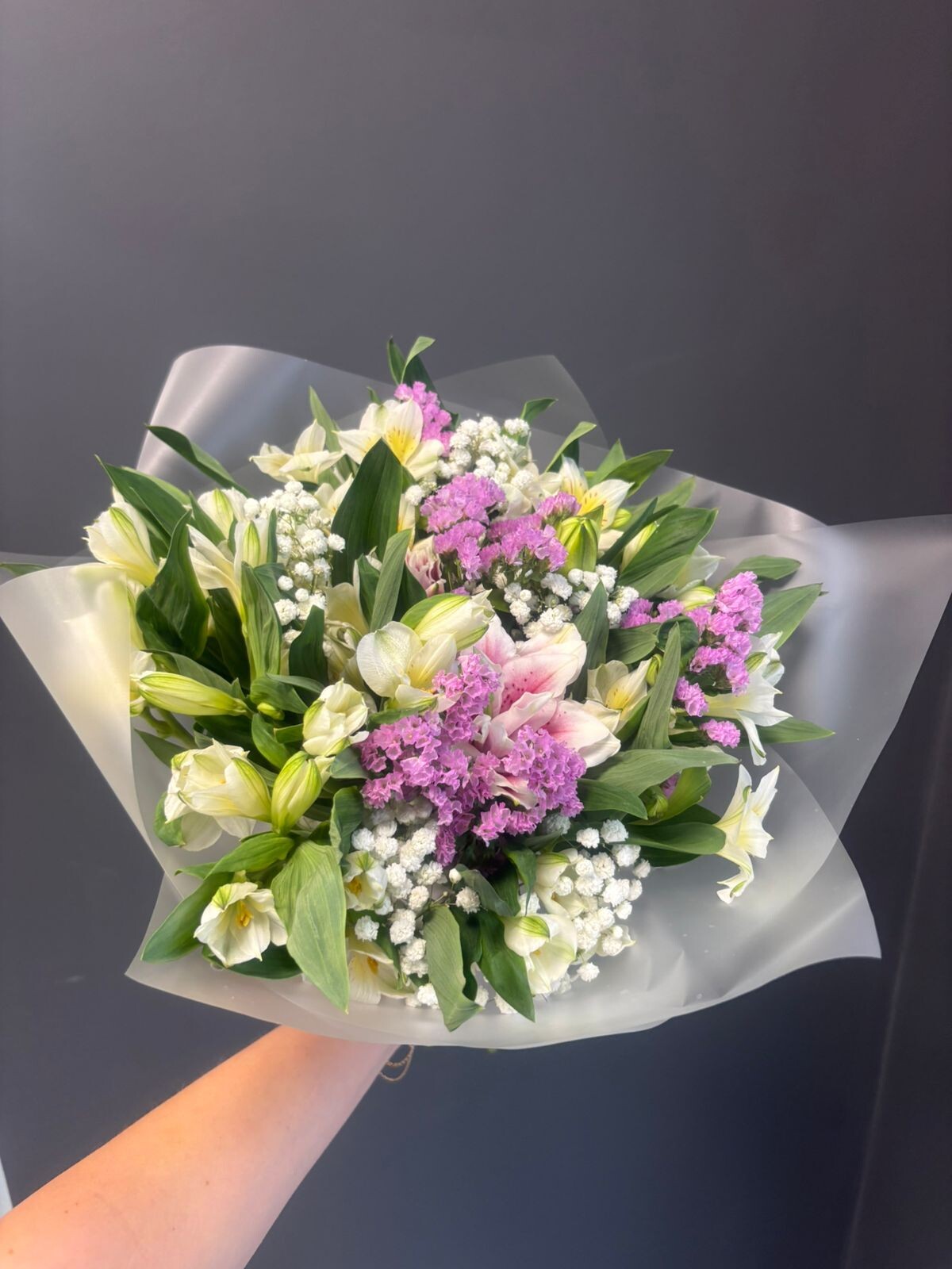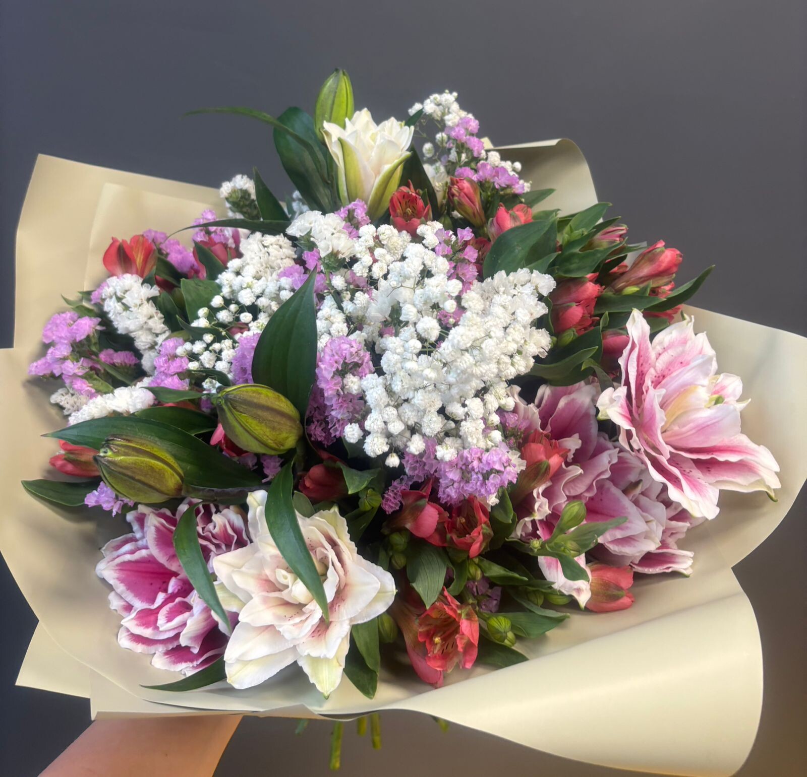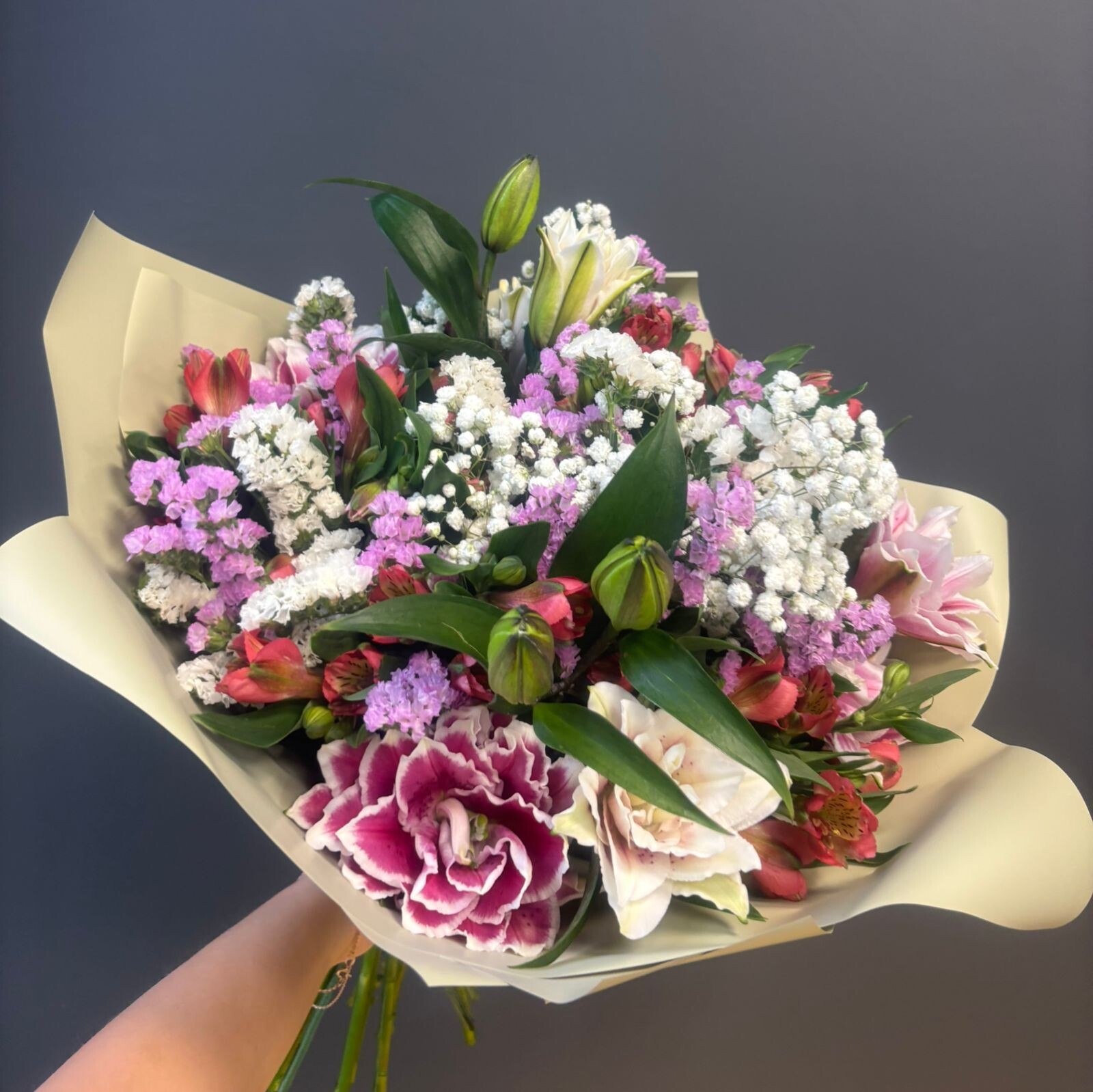 Стильная композиция с розовой лилией и кустовыми розами. Живой контраст нежных оттенков и свежей зелени делает букет универсальным подарком — для радостного события, поздравления или просто знака внимания.