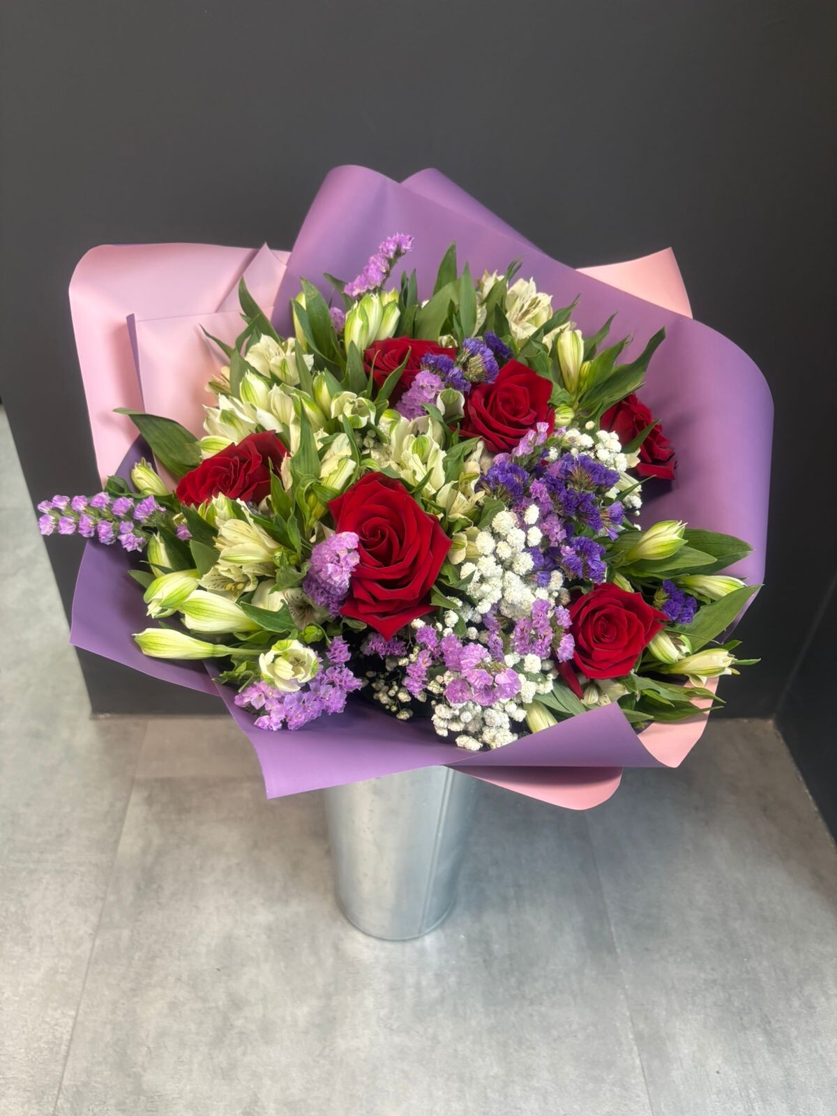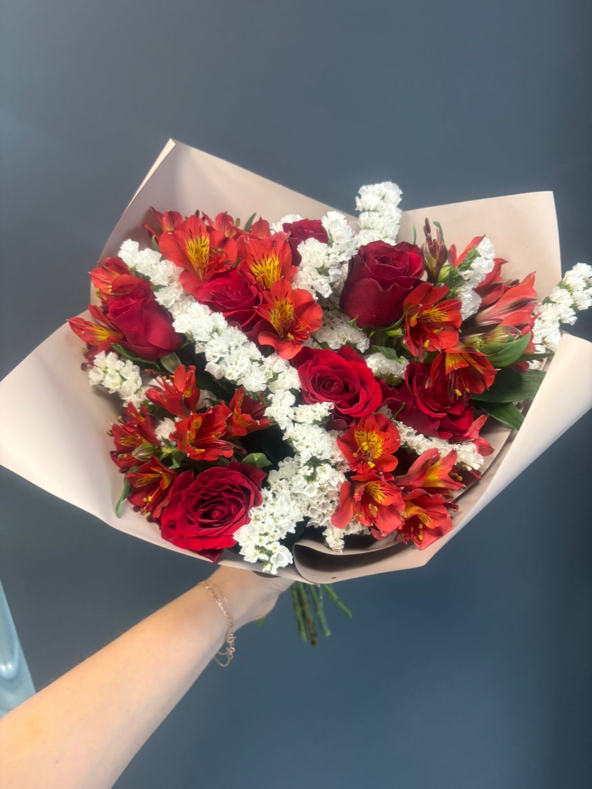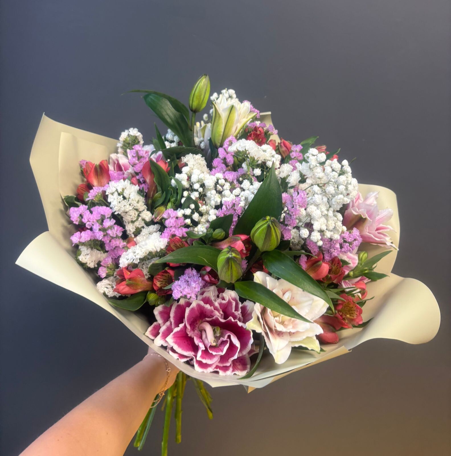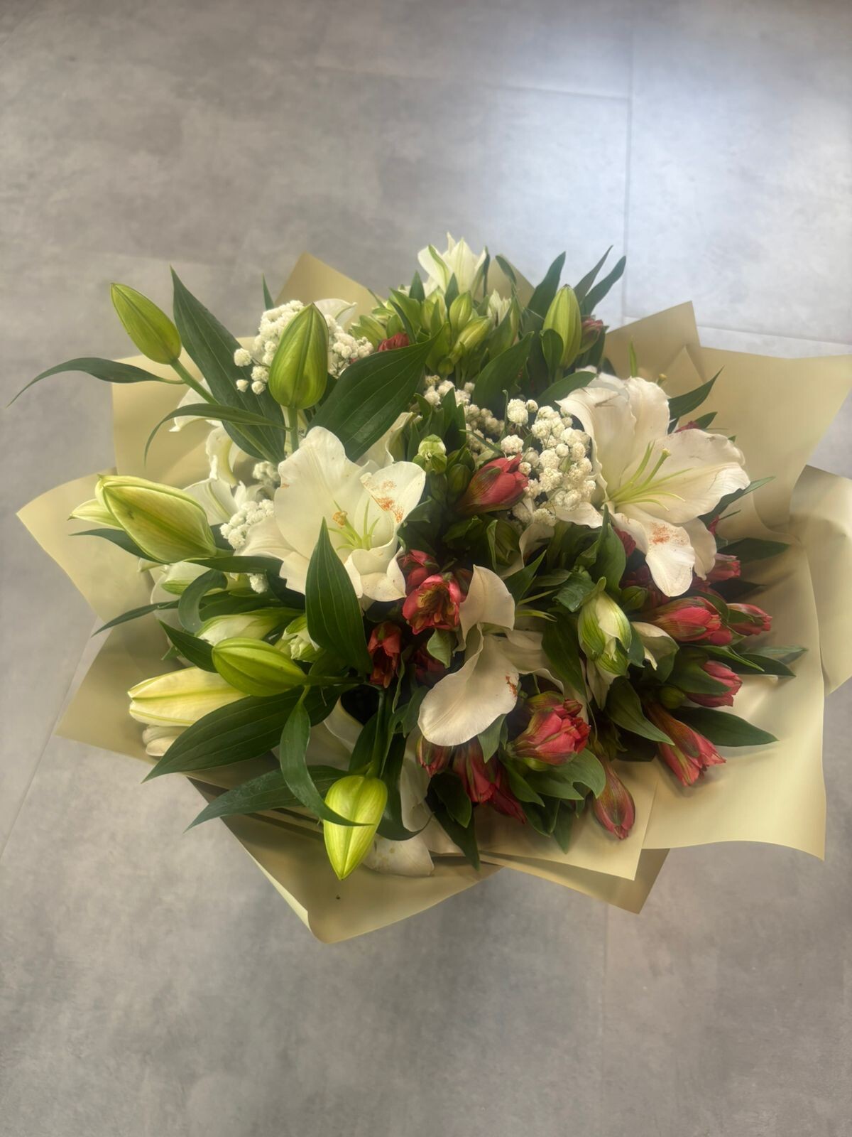 Стильная композиция с розовой лилией и кустовыми розами. Живой контраст нежных оттенков и свежей зелени делает букет универсальным подарком — для радостного события, поздравления или просто знака внимания.