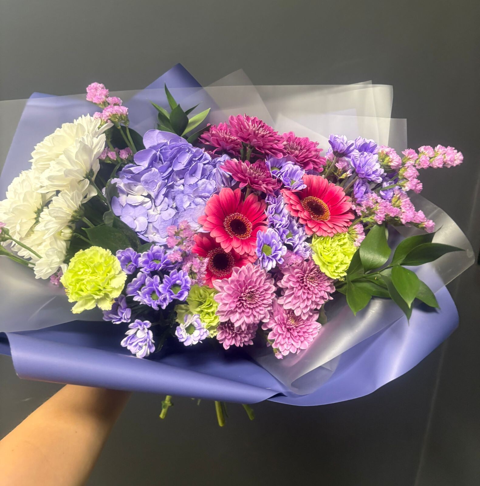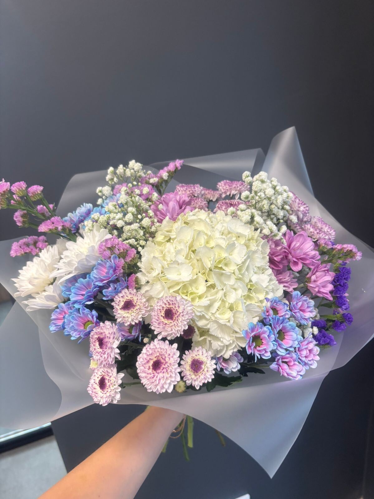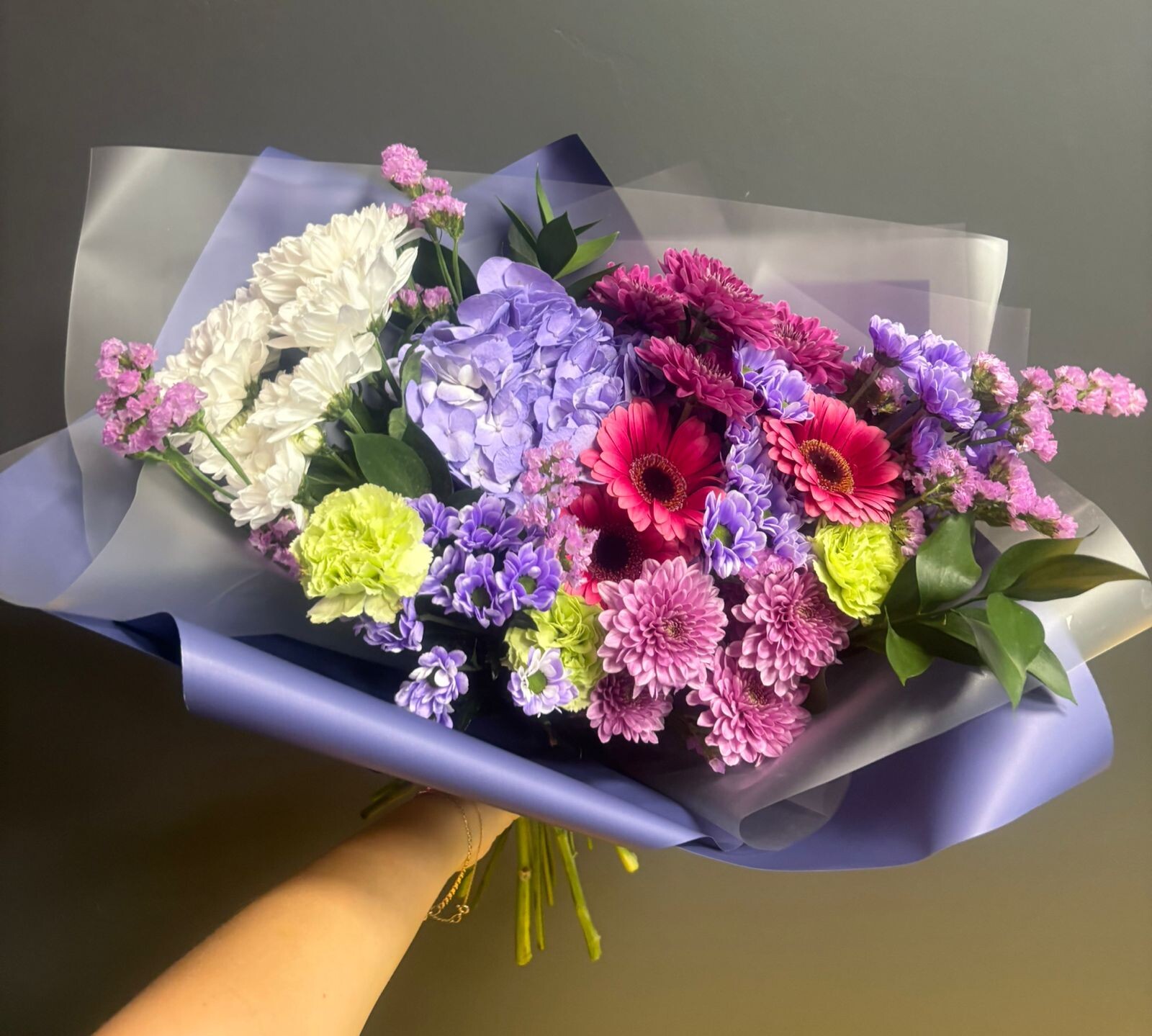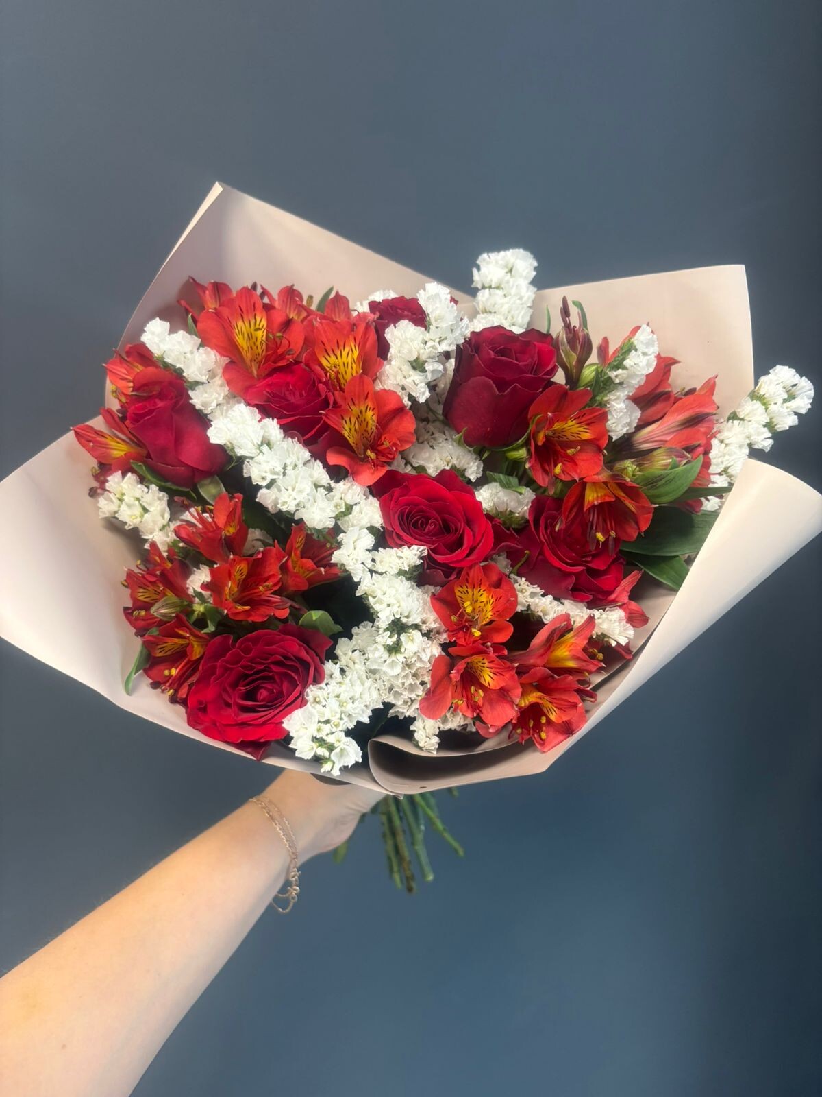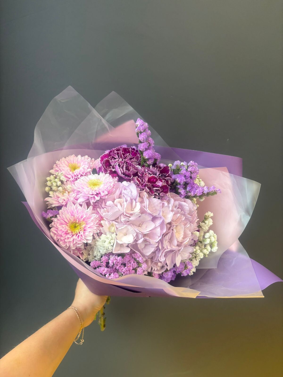 Стильная композиция с розовой лилией и кустовыми розами. Живой контраст нежных оттенков и свежей зелени делает букет универсальным подарком — для радостного события, поздравления или просто знака внимания.