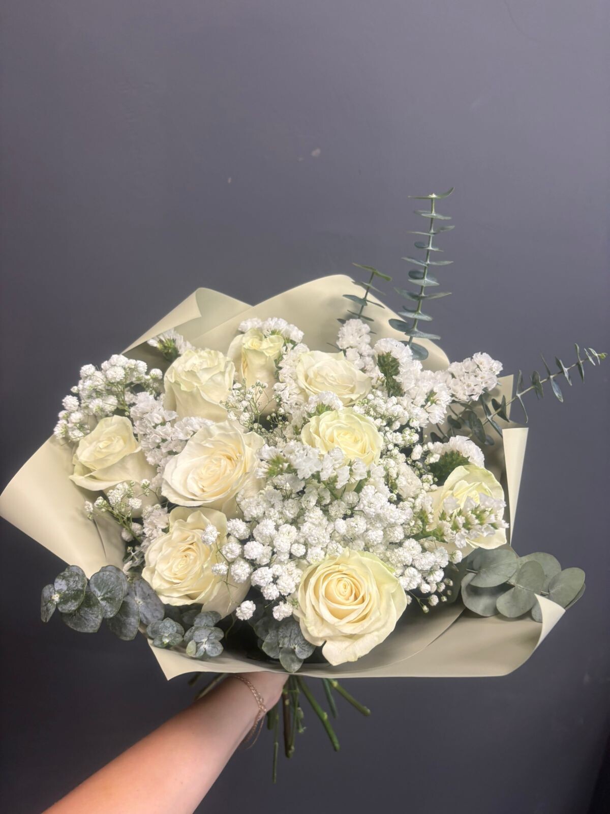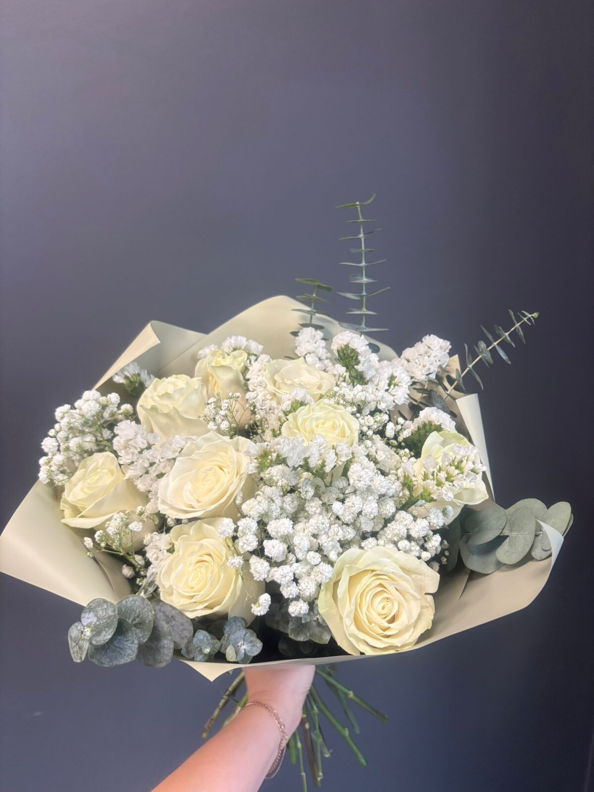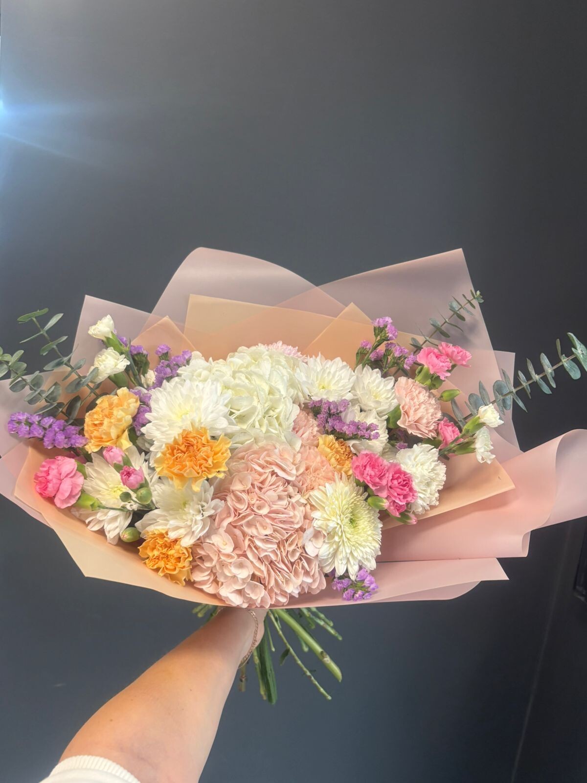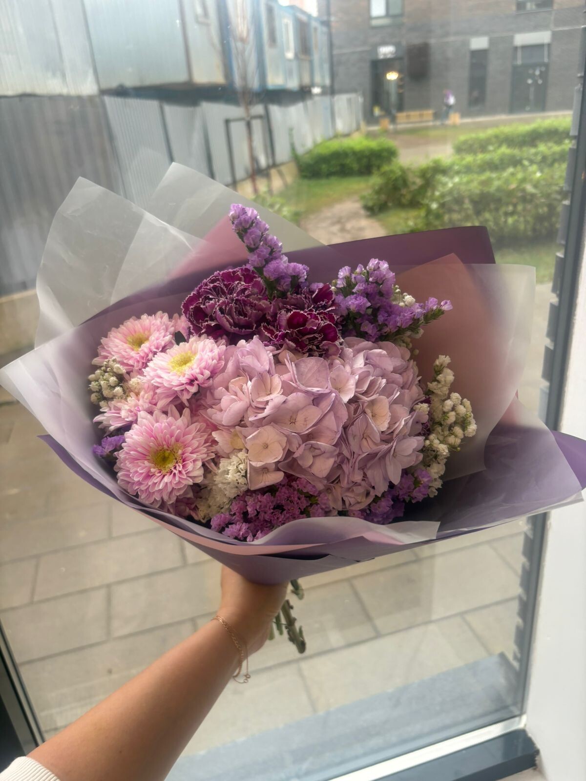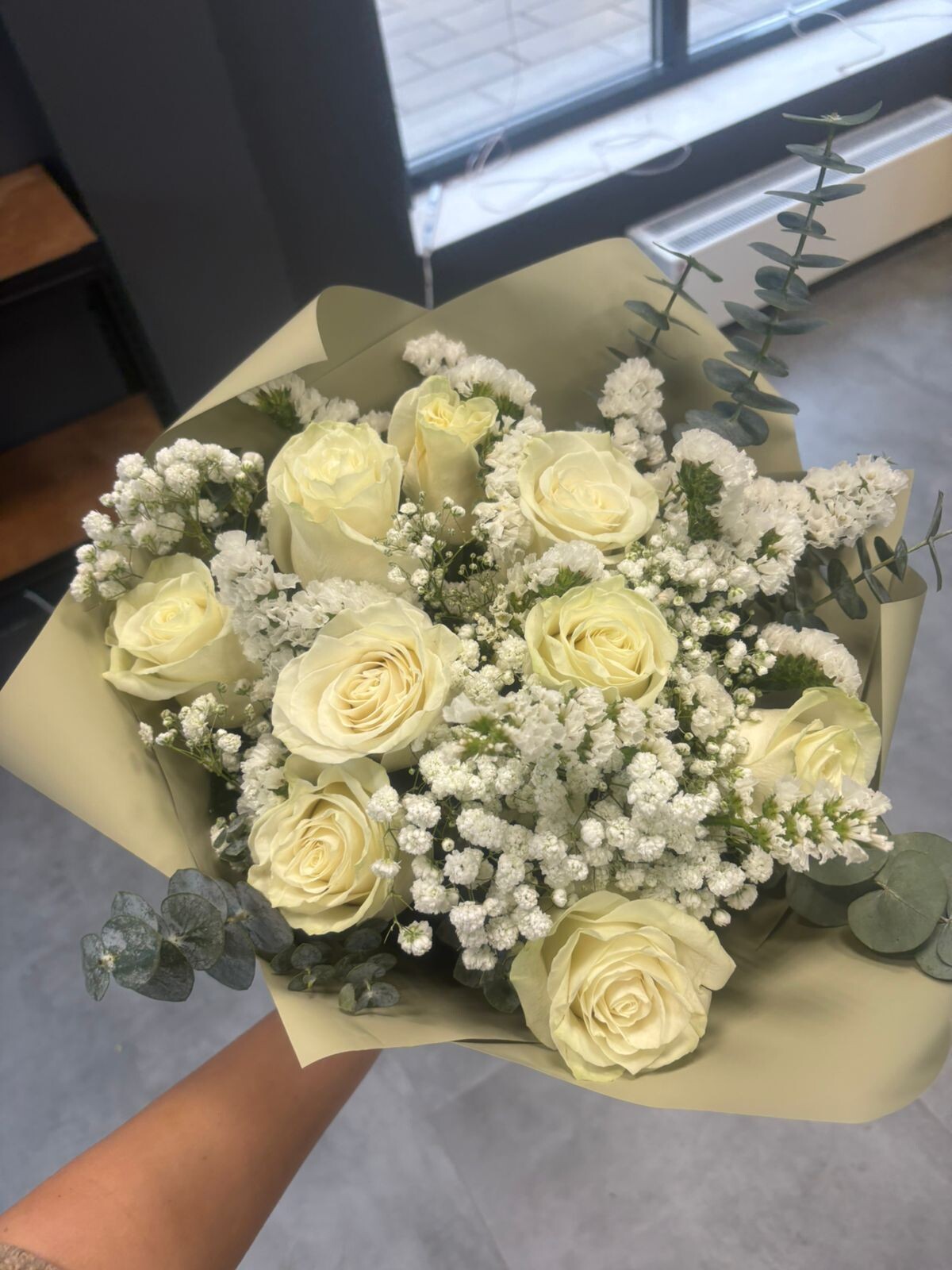 Стильная композиция с розовой лилией и кустовыми розами. Живой контраст нежных оттенков и свежей зелени делает букет универсальным подарком — для радостного события, поздравления или просто знака внимания.