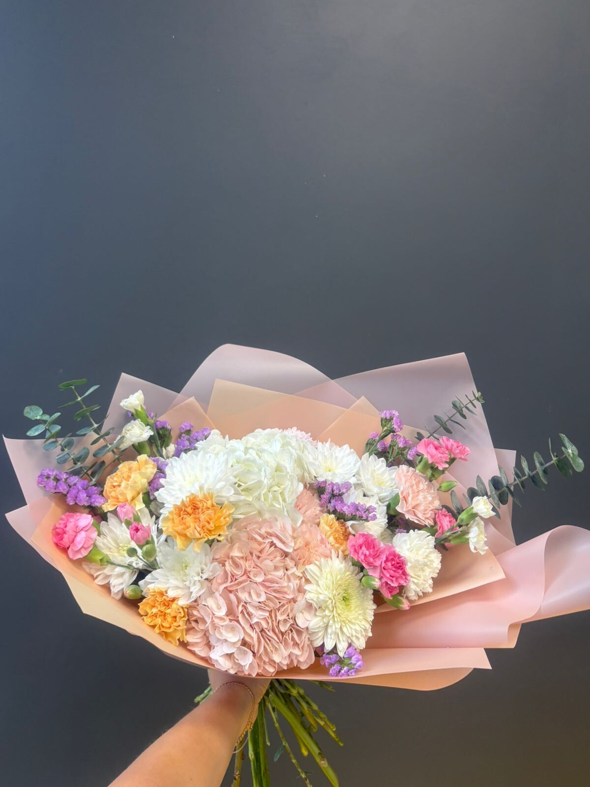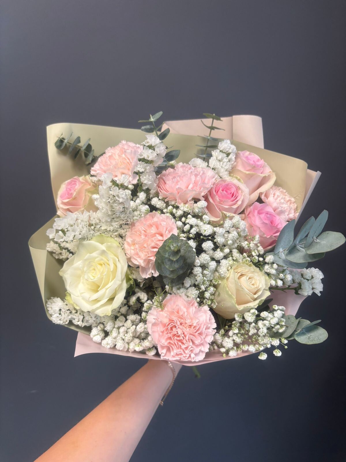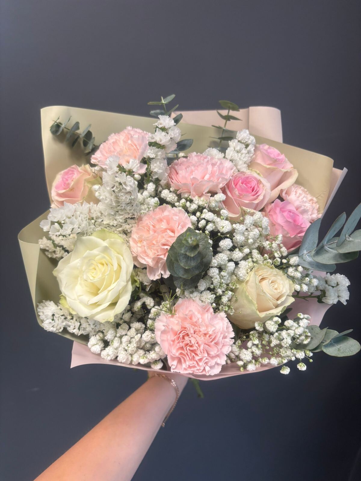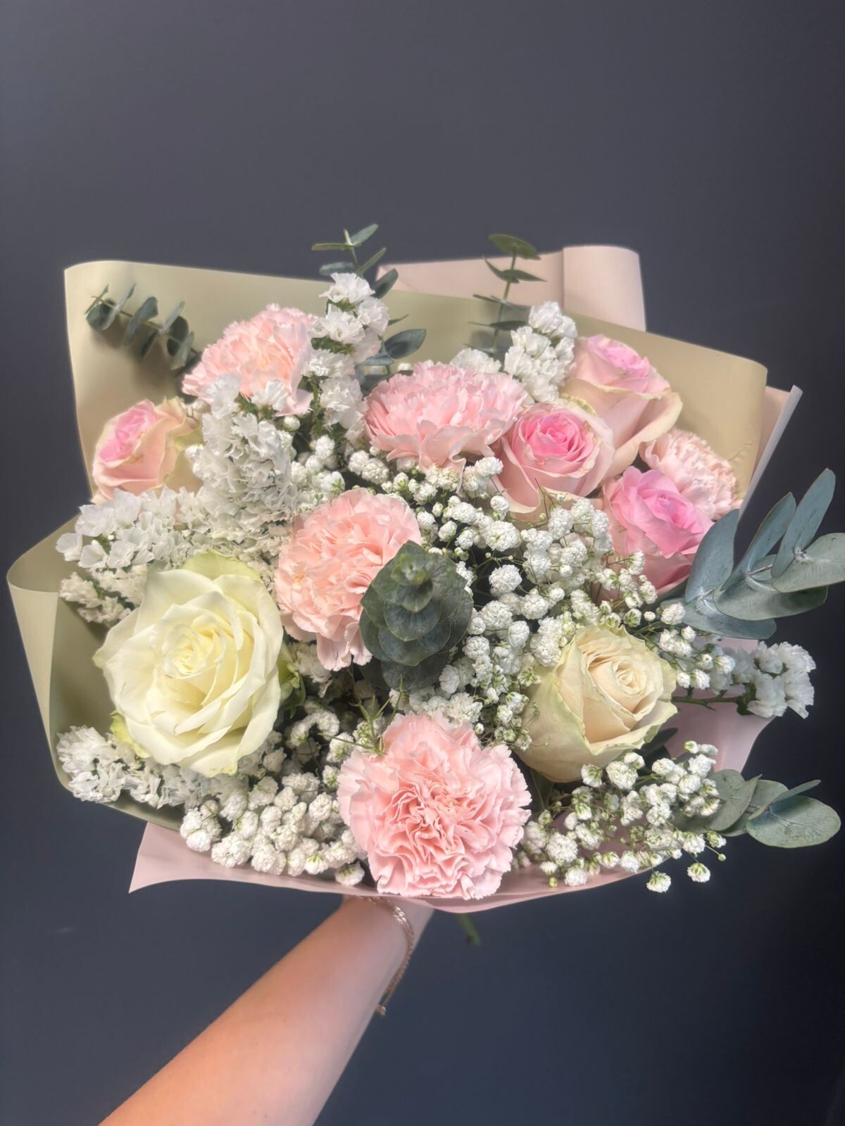 Розовый акцент. Композиция из роз, гвоздик и зелени