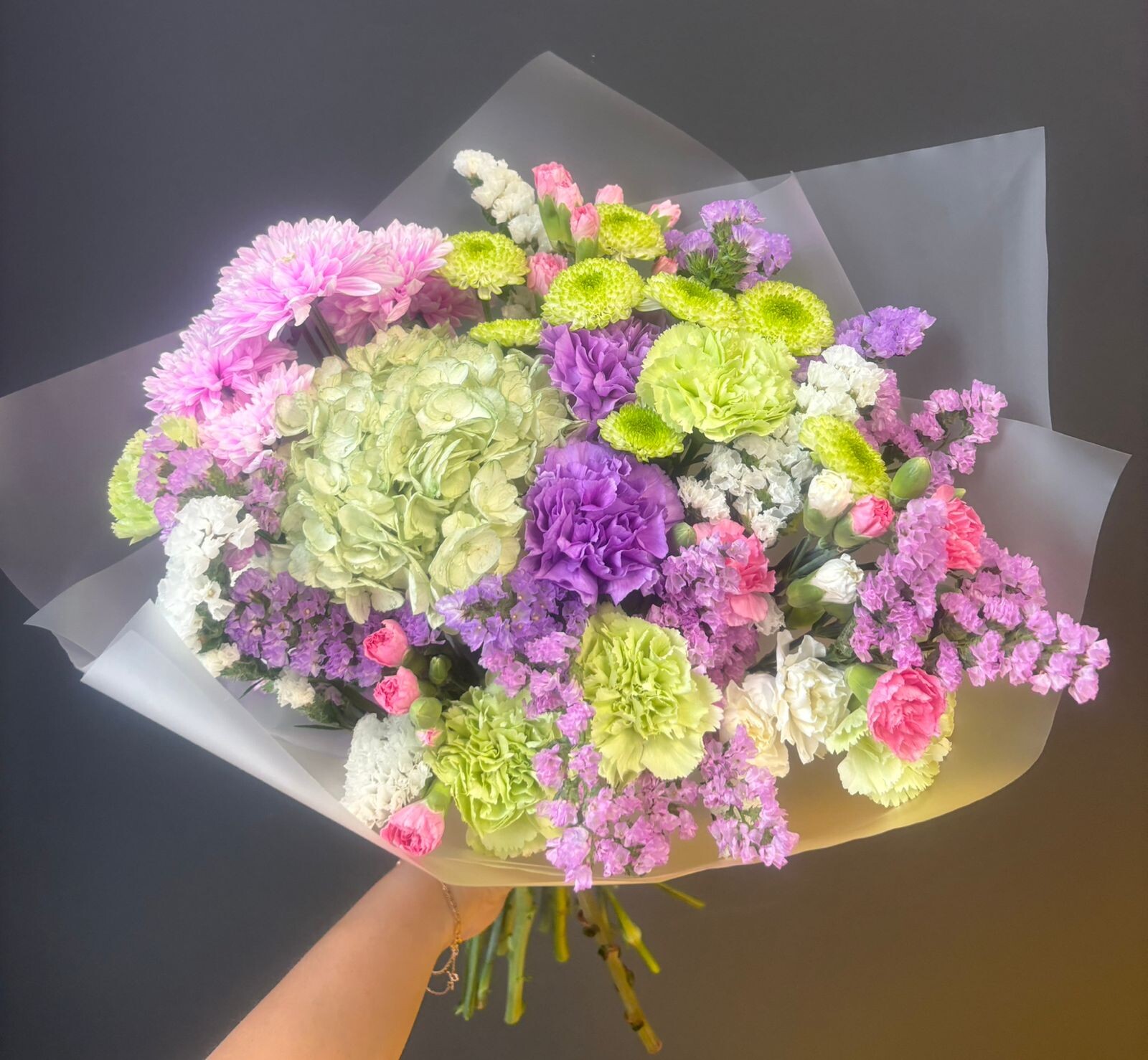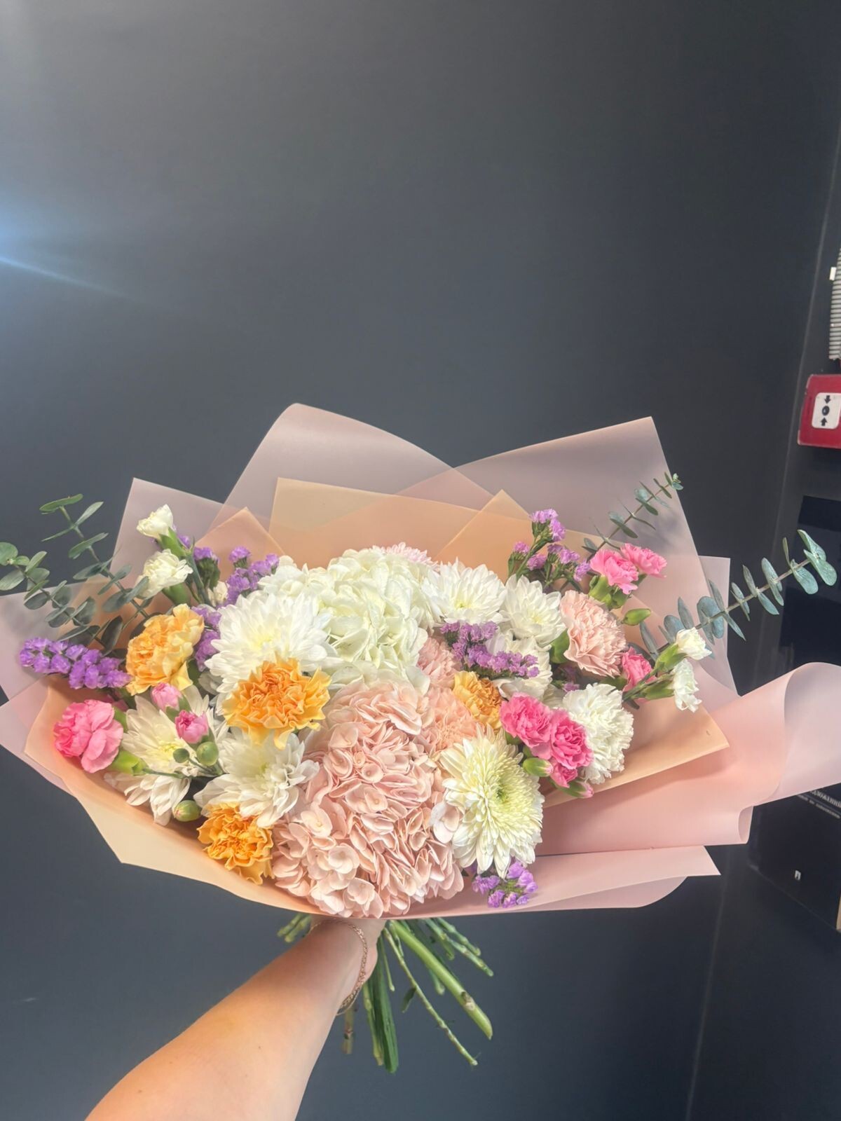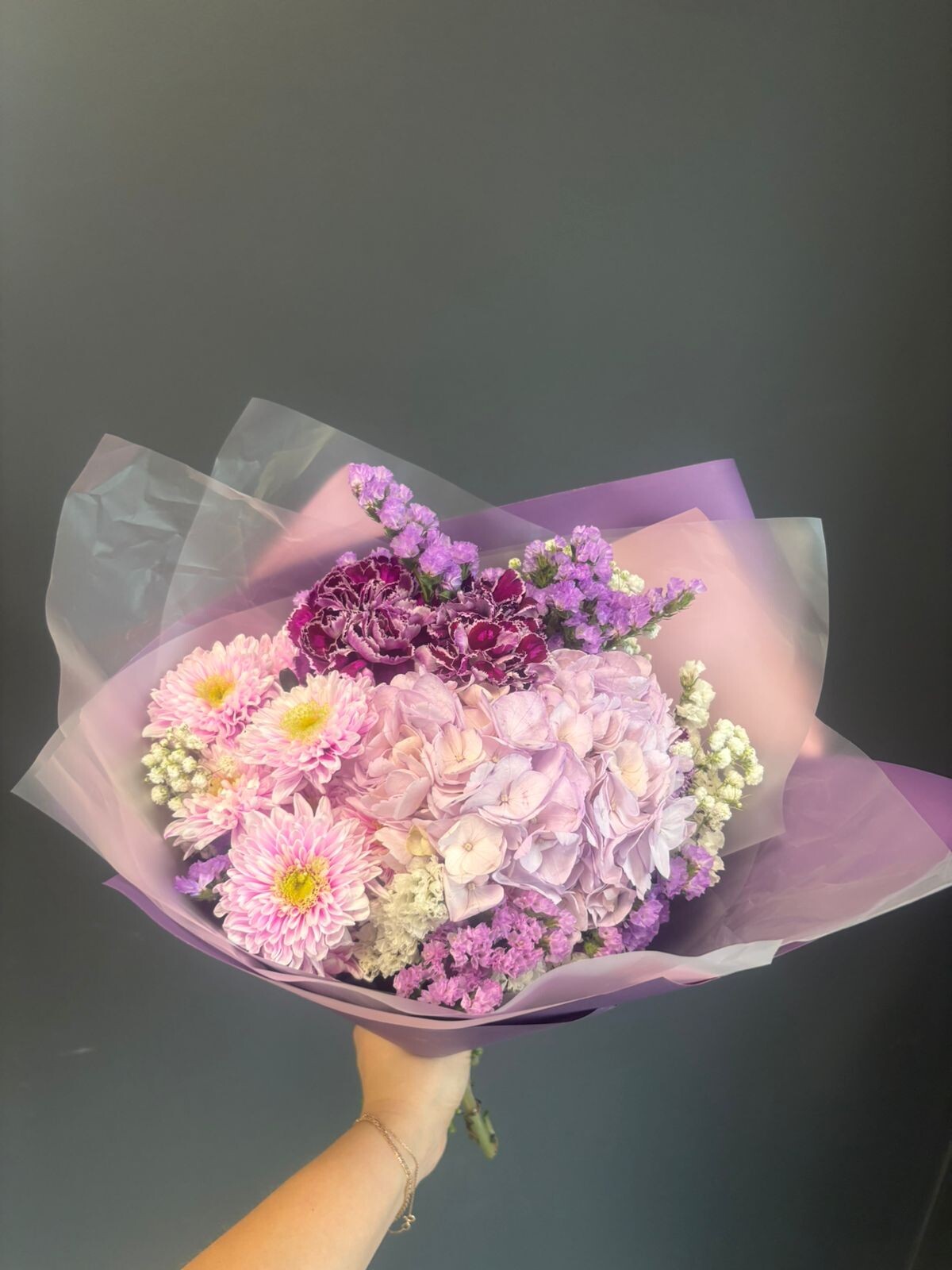 Розовый акцент. Композиция из роз, гвоздик и зелени