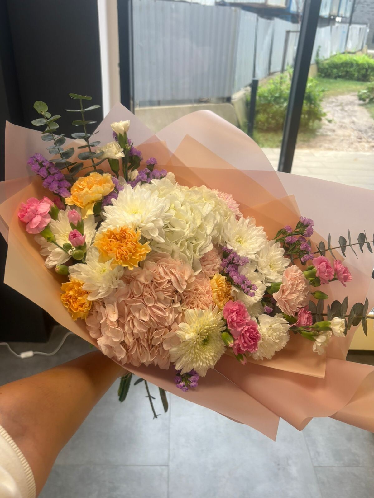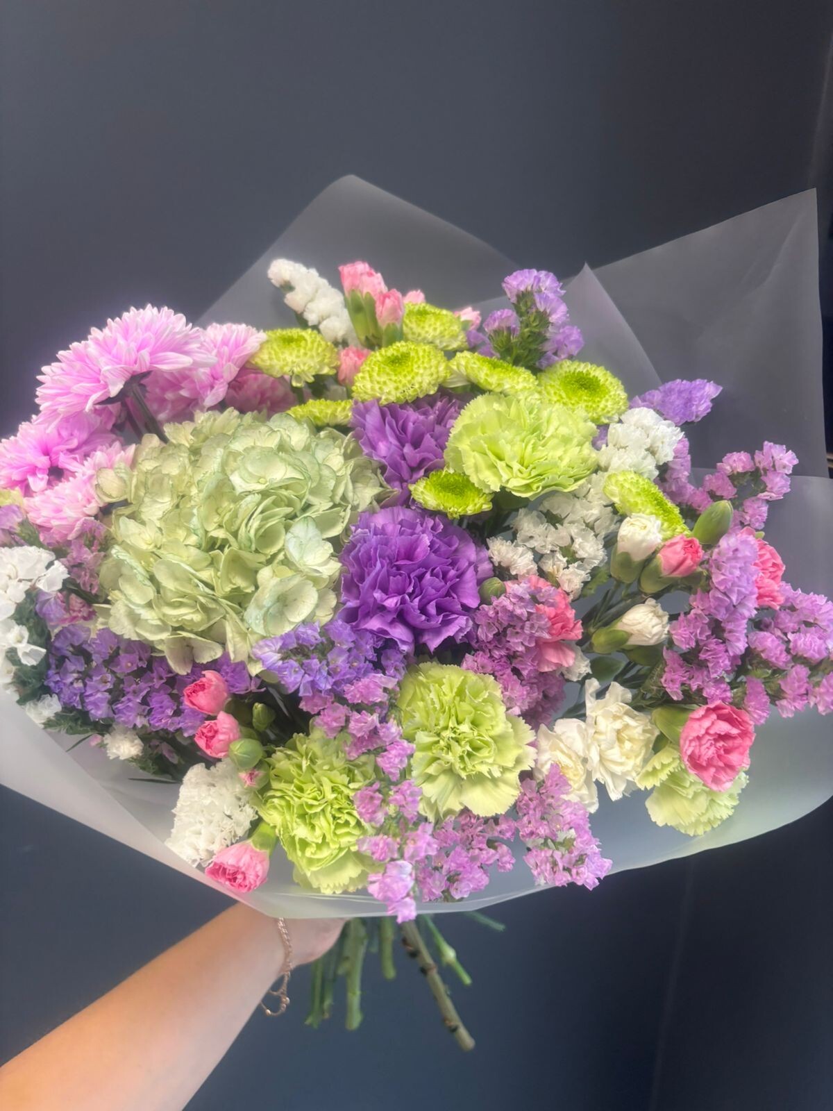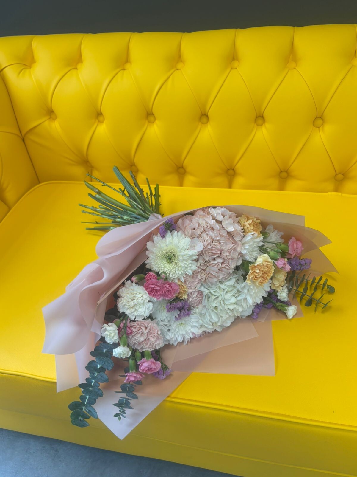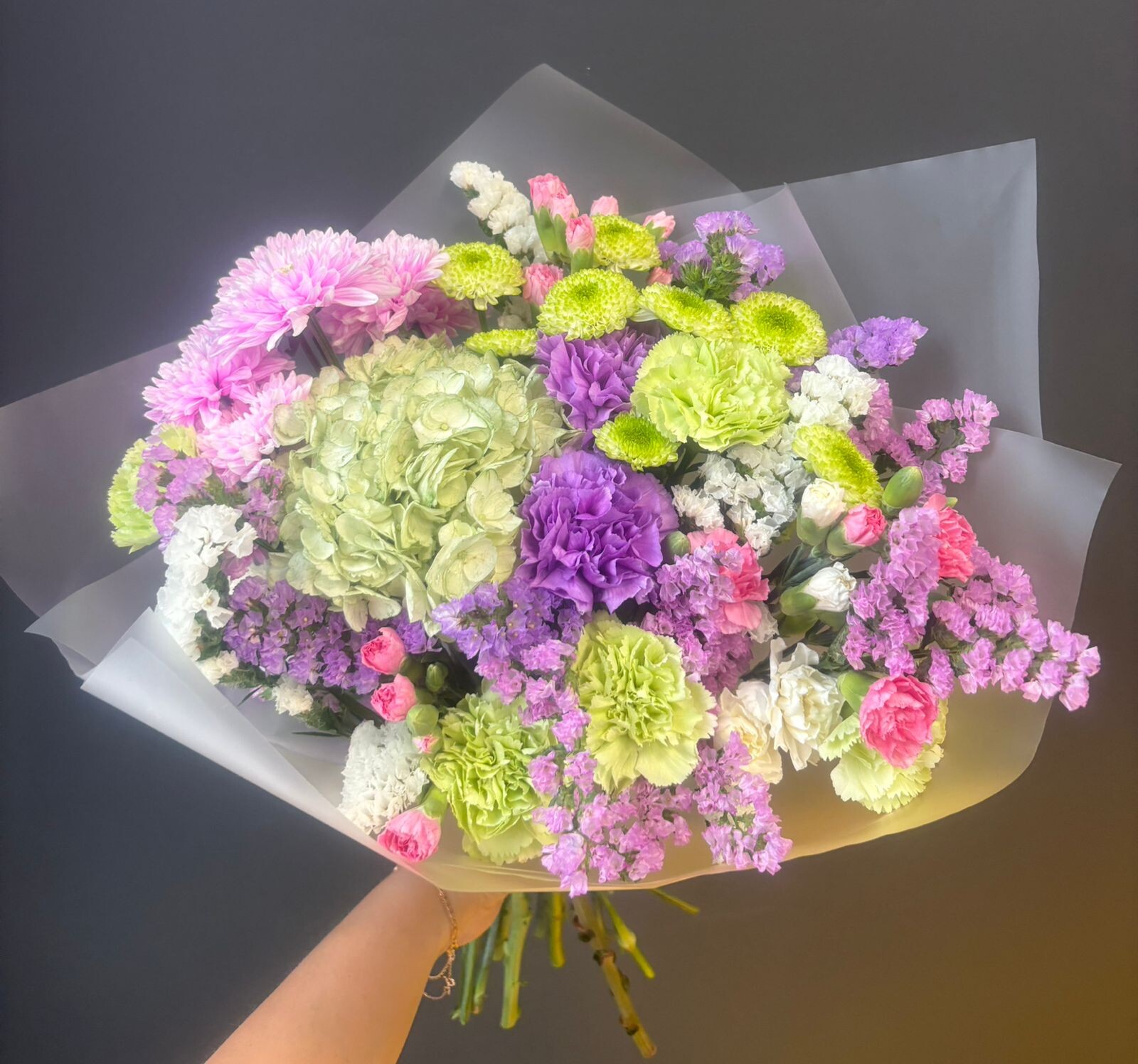 Розовый акцент. Композиция из роз, гвоздик и зелени